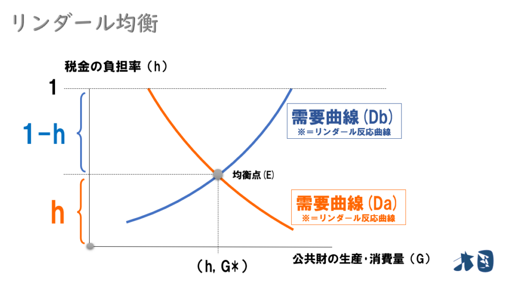 逆にBさんは、Aさんの税金の負担率(縦軸=h)が上がると「Bさんの負担率(1-h)は下がります」。つまり、グラフのに行けば行くほどBさんにとっては「安くなる」ため、公共財をもっと欲しいと思います。(Aさんと逆で右上がり需要曲線(リンダール反応曲線)になる)